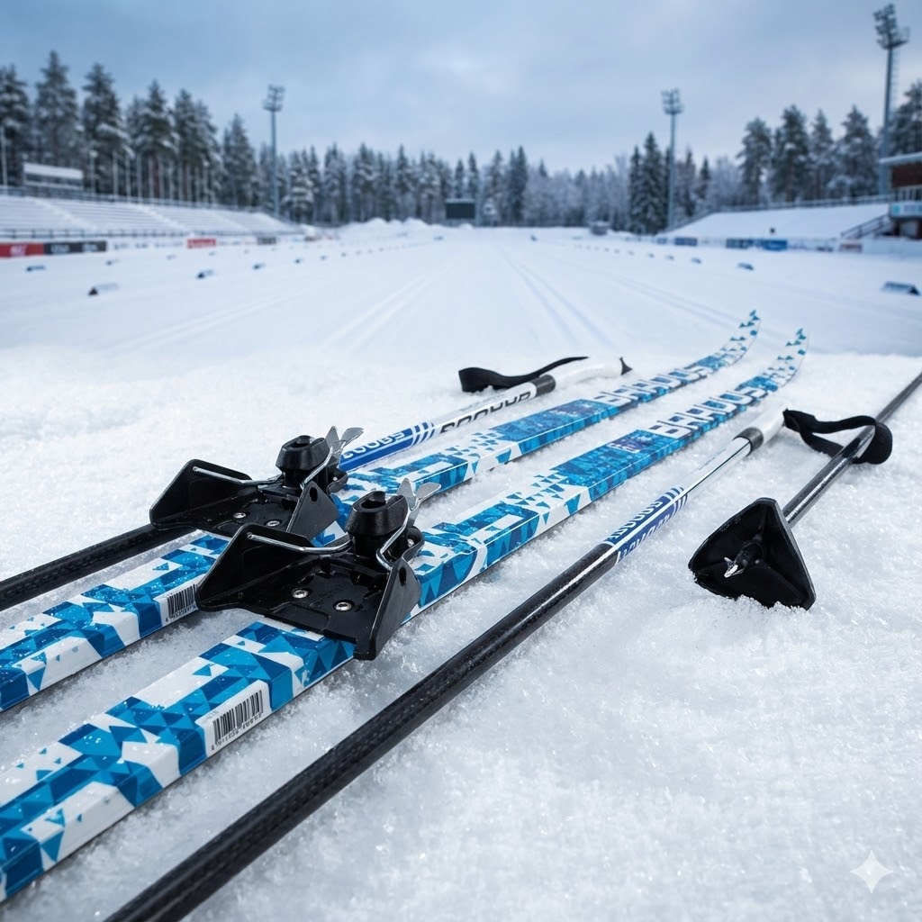 - Лыжные палки — подбираются по росту для правильной техники и комфорта при катании.
